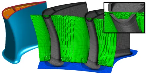 - Nové hybridní síťování v Ansys TurboGrid kombinující tetrahedrální a hexahedrální buňky umožňuje automatizovaně síťovat lopatek rotačních strojů se zahrnutím detailů v oblasti krycího a nosné disku (svary, IGV, VGV atd.).