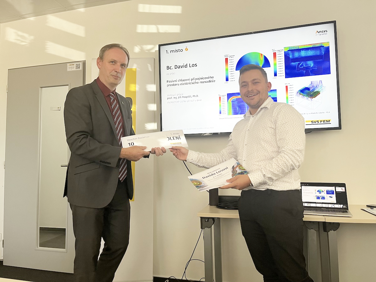 David vyhrává 8 000 Kč + certifikované školení dle vlastního výběru pořádané naší společností. Pan Jiří Pospíšil jako vedoucí práce získává 2 000 Kč. David zaujal porotu především kombinovanou analýzou - elektromagnetická simulace + simulace proudění tekutin se zapojením více softwarů Ansys (Fluent a Maxwell). Zároveň se jednalo o praktickou práci řešící reálné zařízení. Hezká ukázka aplikovatelnosti numerických simulací v praxi.
